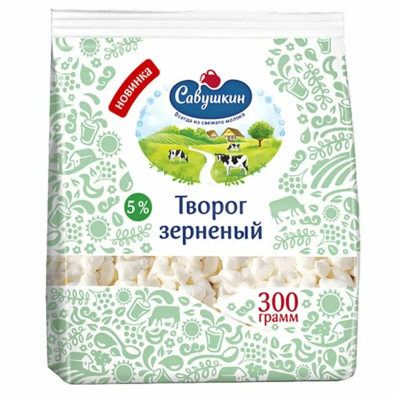 Творог САВУШКИН ХУТОРОК массовой долей жира 5%, МЛТВак мягкий, 300г